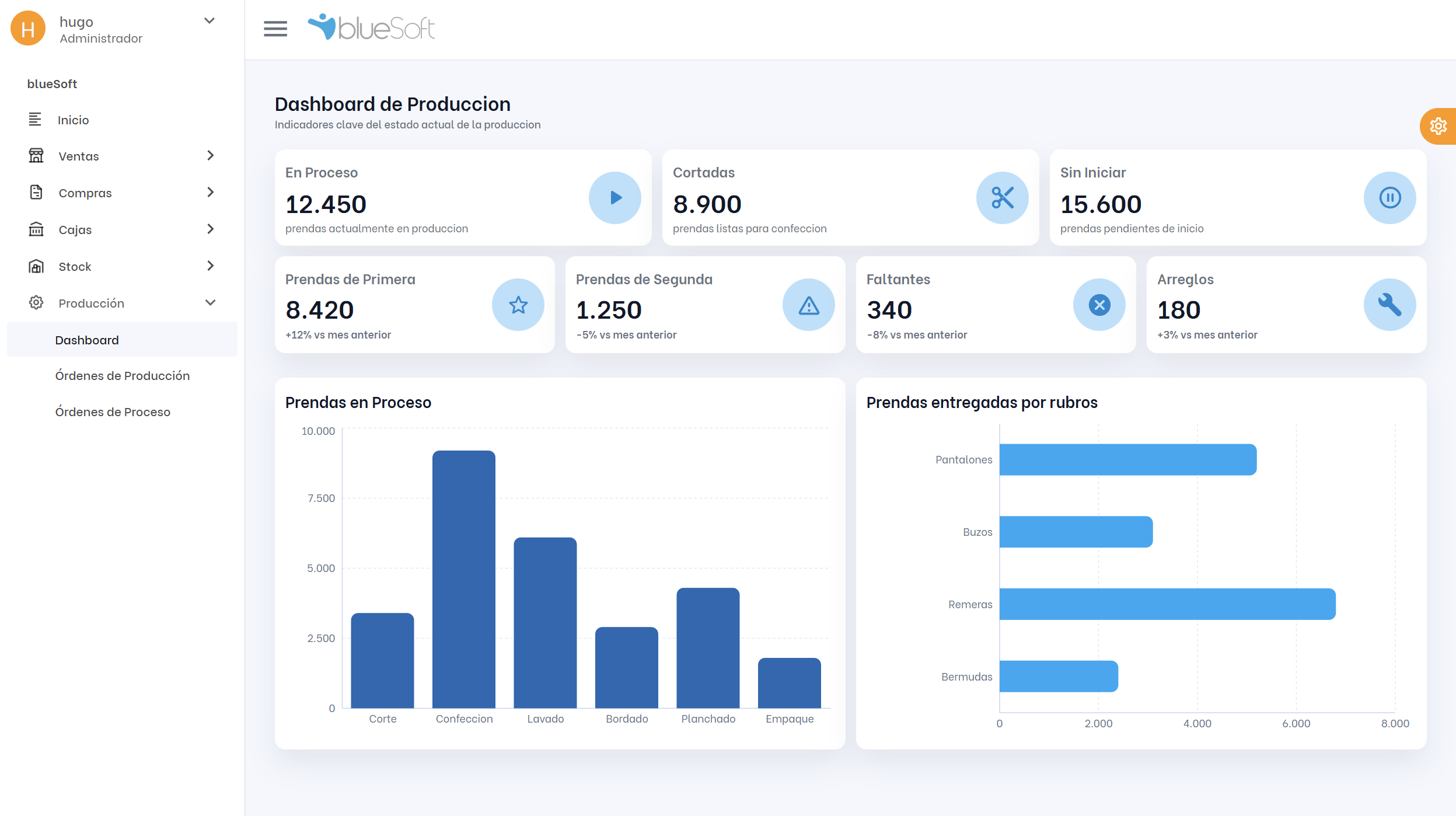 Visualizá indicadores clave del estado actual de tu producción. Controlá prendas en proceso, cortadas, sin iniciar, de primera y segunda calidad, faltantes y arreglos en un solo lugar.